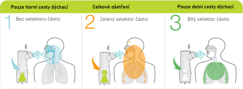 Volbou druhu plastového kloboučku (trysky) a selektoru částic, které použijete v rozprašovací ampuli, můžete upravovat velikost vytvářených částic léčiva a volit tak, kterou část dýchacích cest budete během inhalace ošetřovat.