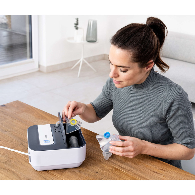 K inhalátoru stačí připojit příslušenství, nalít léčebnou látku do rozprašovací ampule, stisknout tlačítko napájení a můžete začít inhalovat. Rozprašovač a použité příslušenství po dokončení inhalace omyjte teplou vodou a osušte měkkou utěrkou.Beurer – specialista na zdraví a pohodu