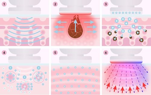 - LED modré (465 nm) světlo – kontroluje tvorbu kožního mazu a akné, zvyšuje produkci kolagenu a redukuje vrásky.