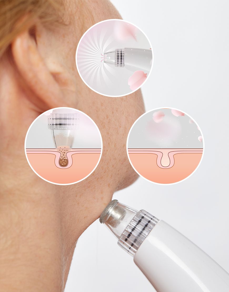 S pěti doplňky získáte kompletní sadu pro péči o obličej v domácím prostředí. Tři hlavy různých velikosti odstraňují nečistoty bez rizika poranění nebo infekce. Textura vaší pokožky se zpevní a získá zpět svůj jas.- Střední hlavice poskytuje ideální sací plochu pro tváře a čelo.