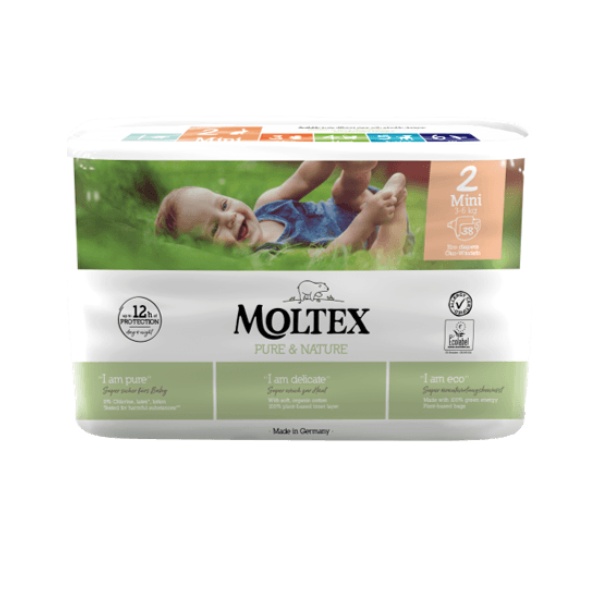 - ekologické balení – výrobce usiluje o snížení produkce plastů, proto jsou obaly plenek Moltex vyrobeny ze 100% recyklovaných materiálů