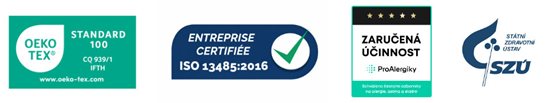 Povlaky ProtecSom jsou zařazeny jako zdravotnický prostředek třídy I a vyráběny v souladu s normou ISO 13485, která stanovuje přísné požadavky na kvalitu a spolehlivost. Certifikát ÖKO-TEX třídy 1 zároveň potvrzuje, že neobsahují žádné toxické látky, a jsou proto zcela bezpečné i pro kontakt s citlivou dětskou pokožkou.