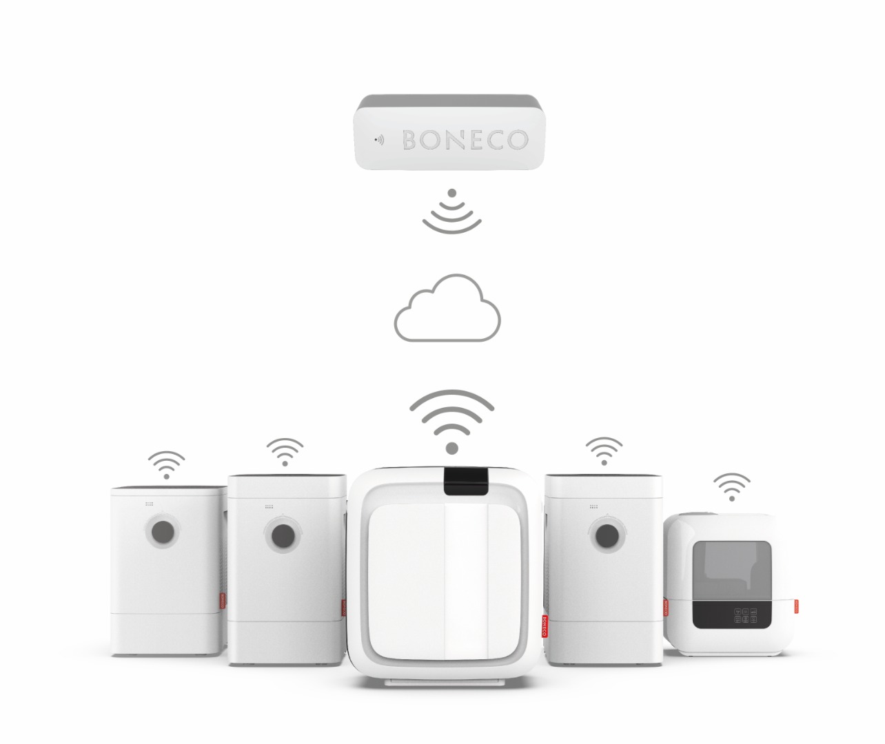 Měření a zaznamenávání hodnot v reálném čase. Propojení s mobilní aplikací Boneco přes Wi-Fi. Spolupracuje s produkty Boneco Smart.