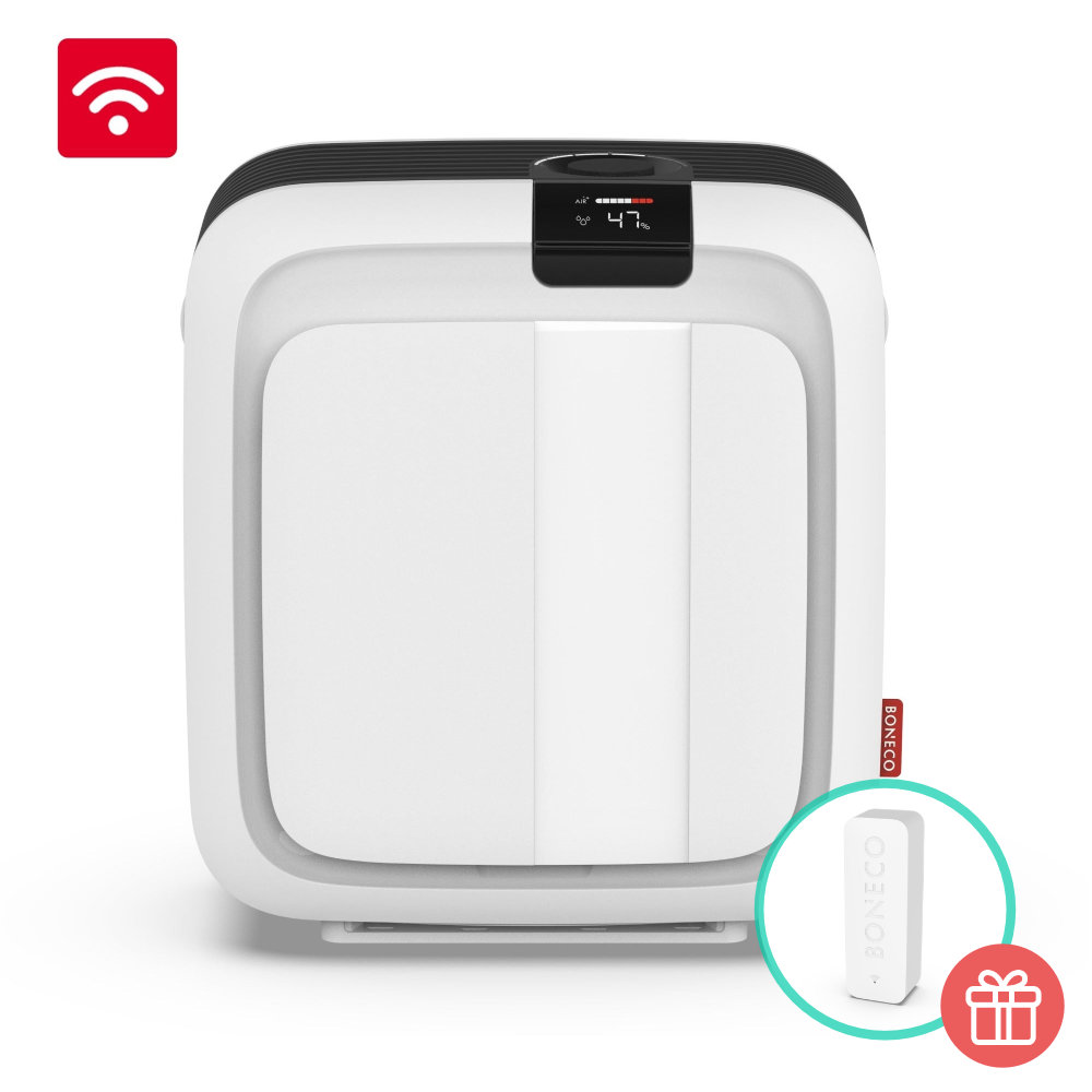 Zařízení můžete propojit s chytrým externím senzorem Boneco X50 (volitelné příslušenství), který měří kvalitu vzduchu přímo tam, kde skutečně trávíte čas. Zatímco vestavěné senzory mohou být ovlivněny provozem samotného přístroje, externí senzor měří nezávisle a poskytuje tak přesnější výsledky. Vaše zařízení následně automaticky upraví svůj výkon podle naměřených hodnot a pokračuje v práci, dokud není v místě senzoru dosaženo požadované kvality vzduchu.