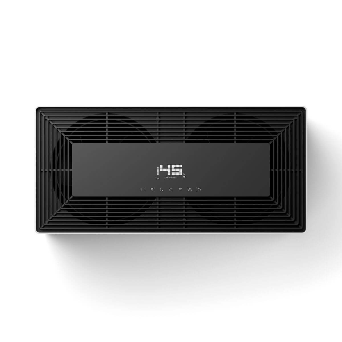 - Automatický režim – vestavěný hygrostat automaticky přizpůsobuje výkon ventilátoru dle naměřené vlhkosti v místnosti. Čím více se aktuální vlhkost blíží nastavené hodnotě (30–75 %), tím nižší je zvolená úroveň rychlosti ventilátoru.